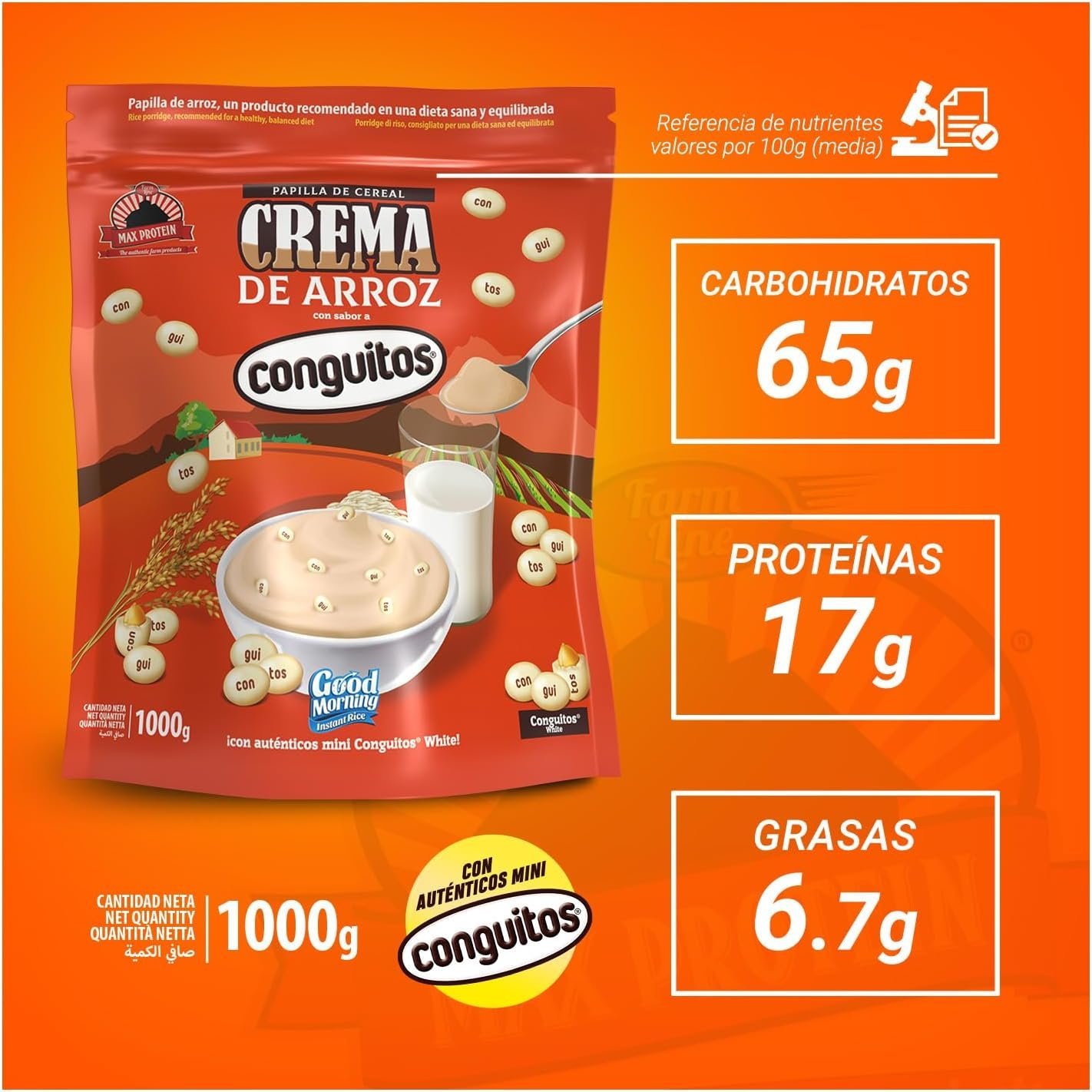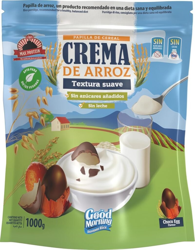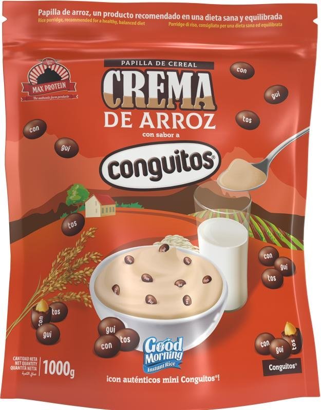 GOOD MORNING Rice Cream with Conguitos offers a smooth, creamy texture with the classic sweet taste of Conguitos. This 1000g family-sized pack is perfect for a gentle, satisfying breakfast or snack that tastes great and keeps you full.